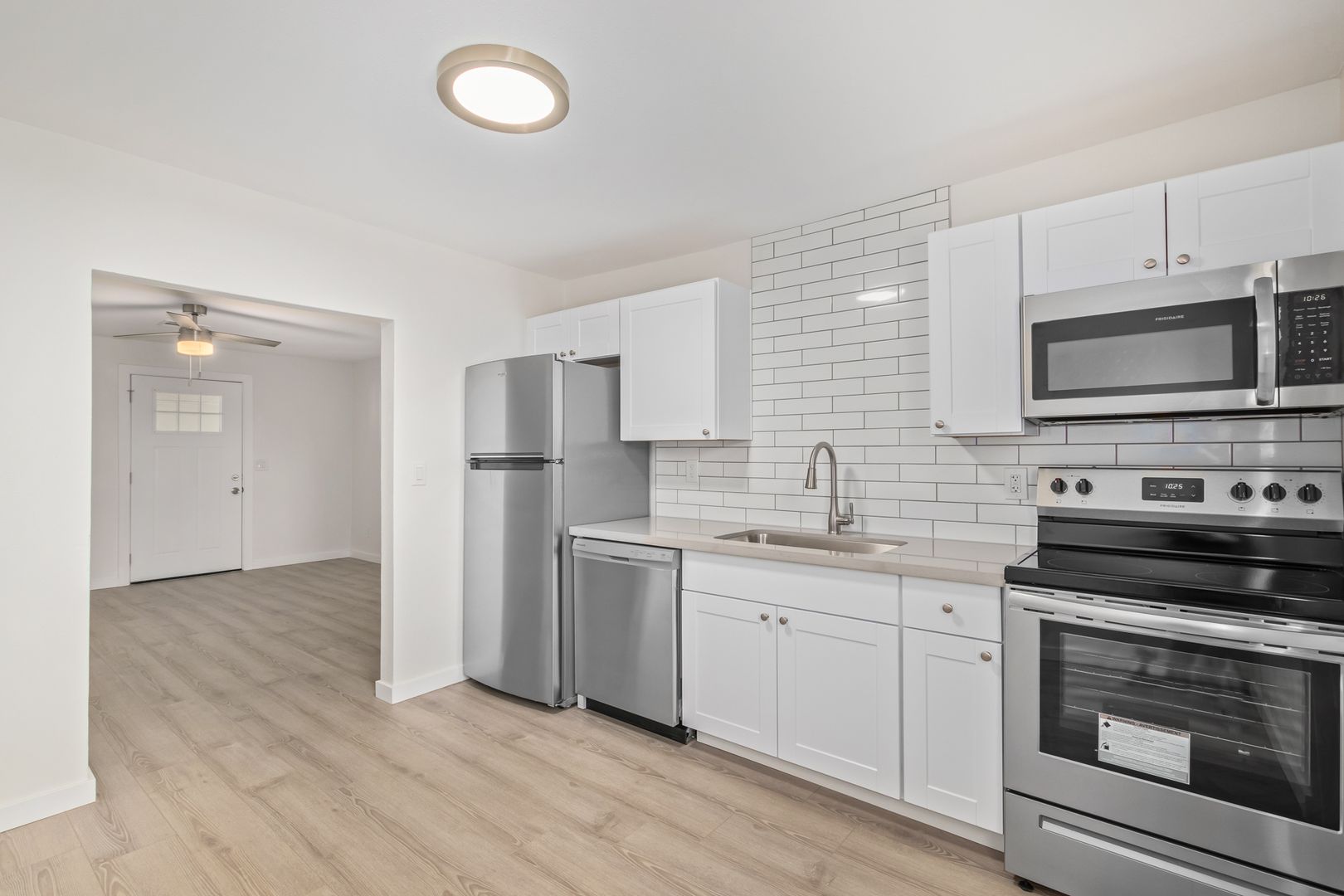 Kitchens: Enjoy the charm of quartz countertops, white shaker cabinets, stainless steel appliances, and elegant white subway tile backsplashes.