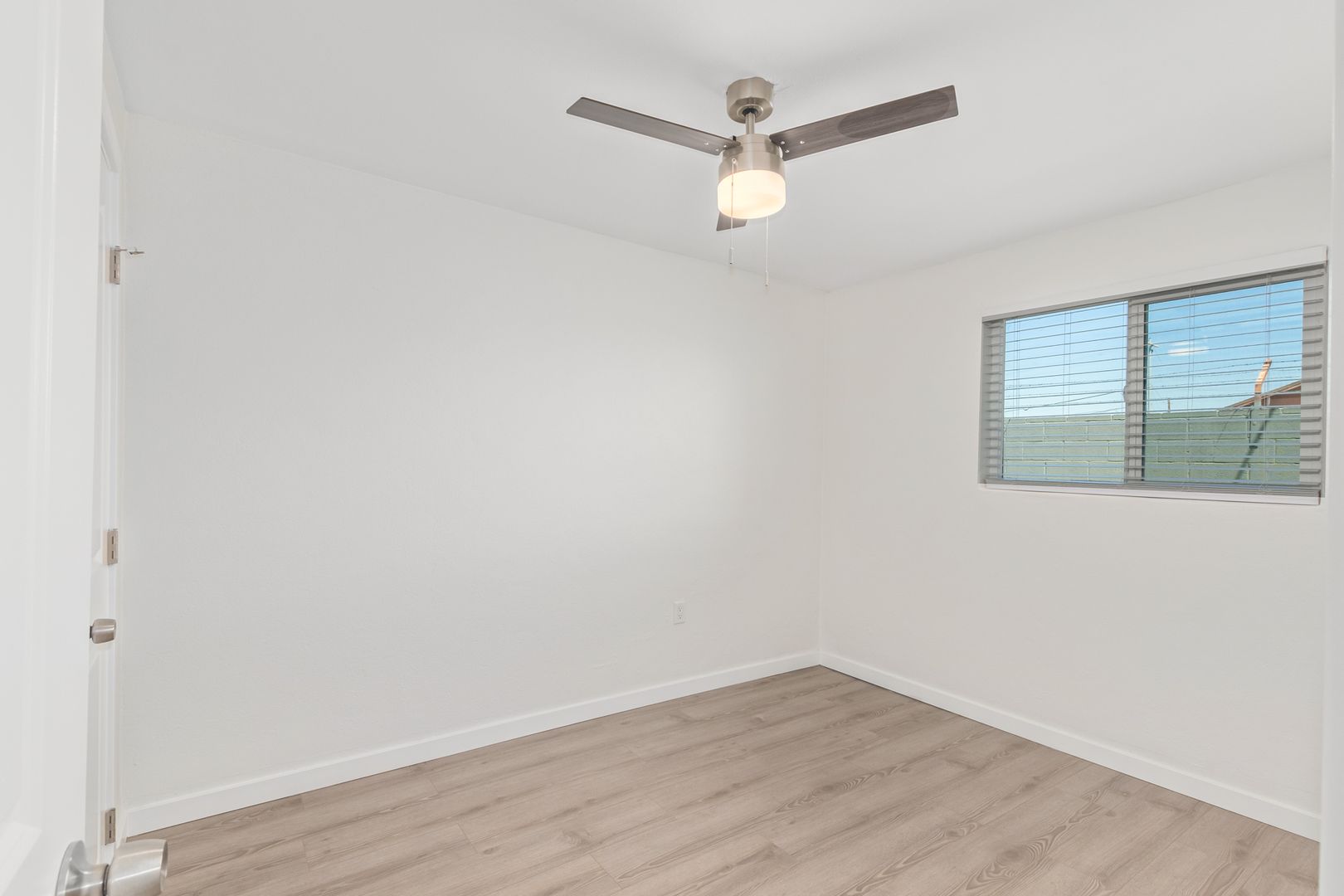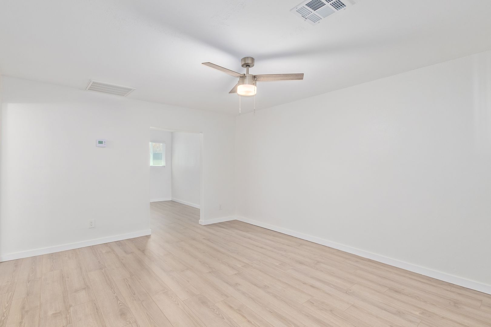 Living Spaces: The light, wood-styled flooring creates a warm and inviting atmosphere, seamlessly leading into spacious bedrooms that easily accommodate a king-sized bed and nightstands.