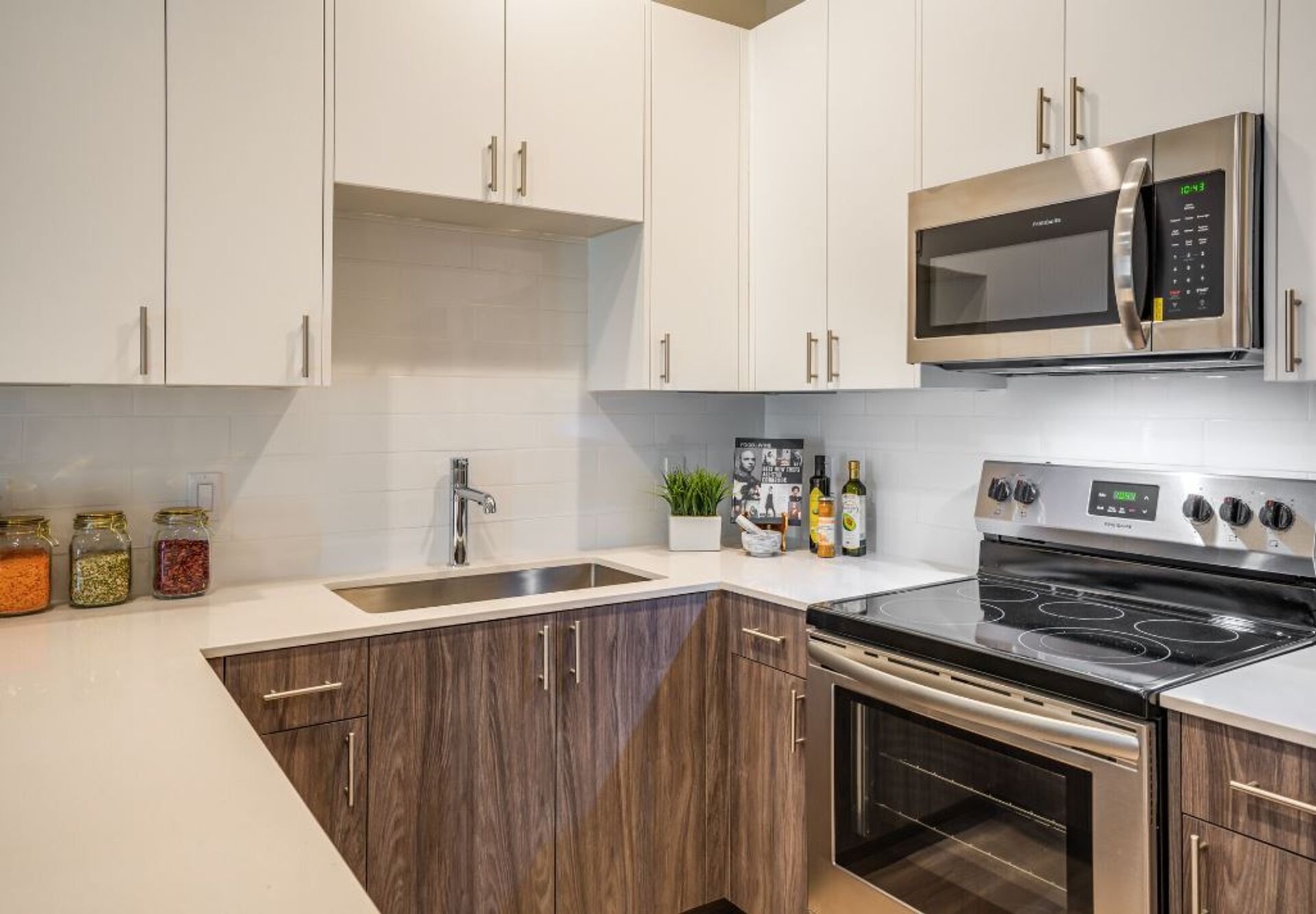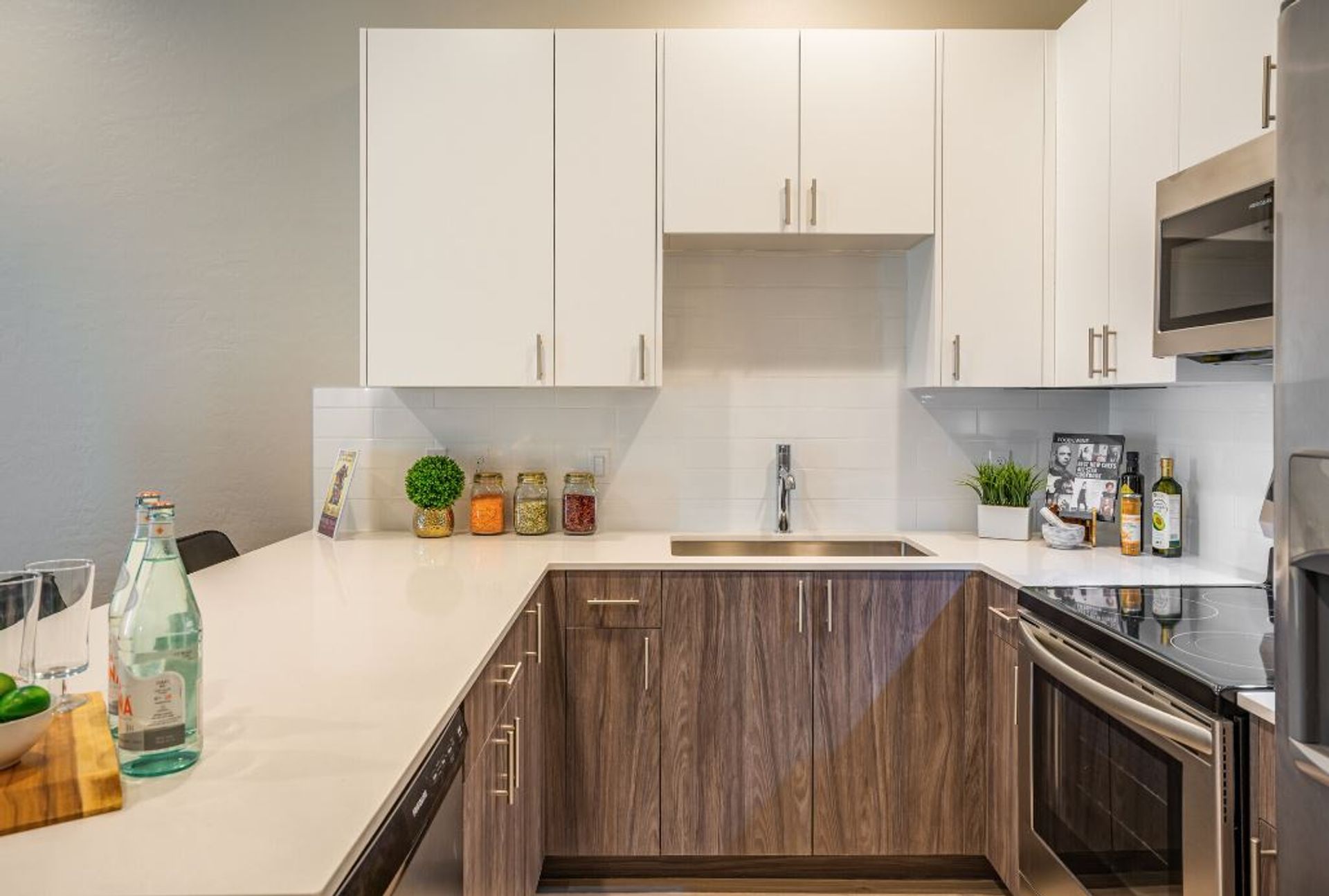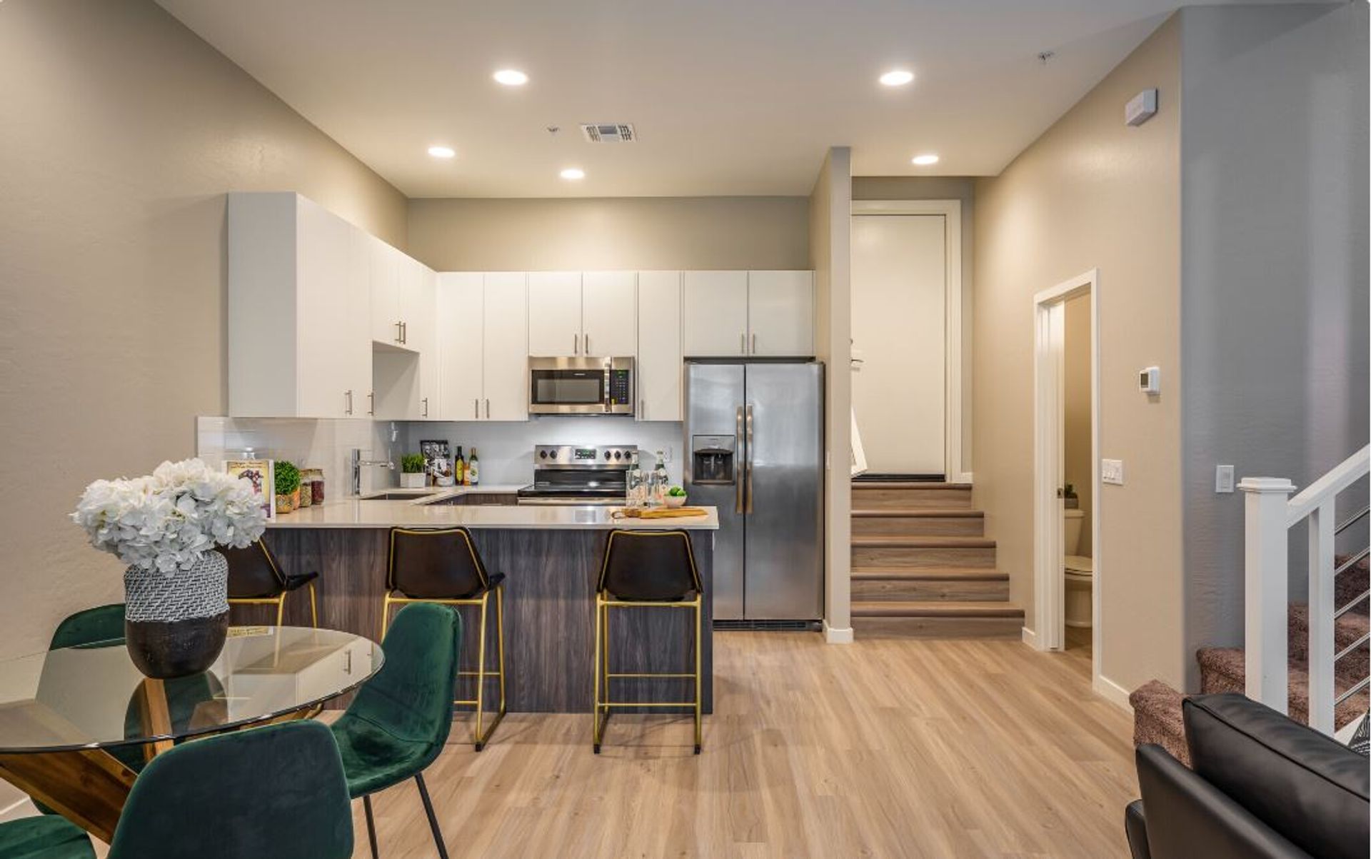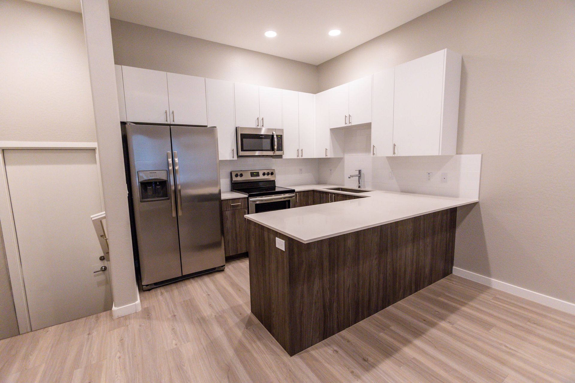 State-of-the-art modern kitchens with residential full-size side-by-side stainless steel refrigerator, granite countertops, subway tile backsplashes, and custom cabinetry with soft-close doors