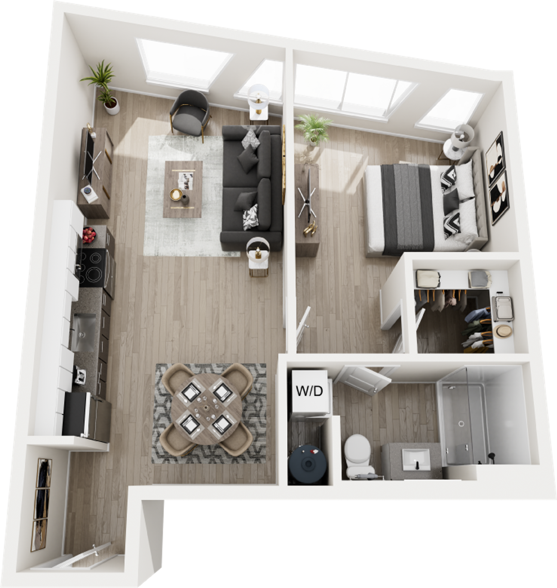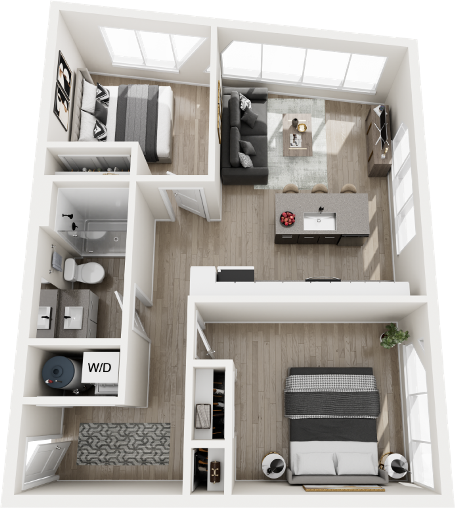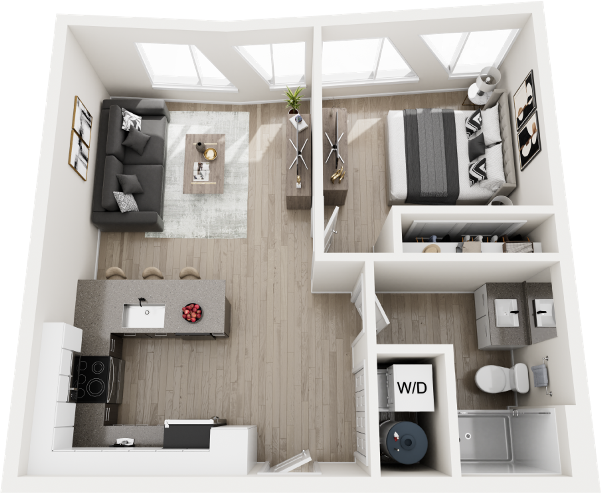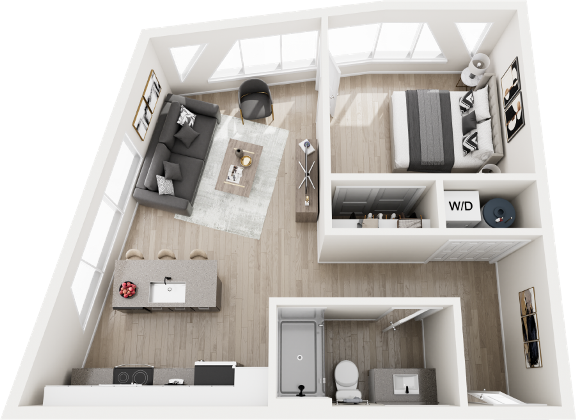Perfectly scaled for modern city living, our one-bedroom residences offer a refined retreat in the heart of the Roosevelt Road district. These brand-new apartment homes feature open-concept layouts designed to maximize space, light, and functionality. Luxury vinyl plank flooring flows throughout, while high-end kitchens showcase quartz countertops, custom cabinetry, and stainless steel appliances. Expansive windows bring in abundant natural light, creating a bright and energizing atmosphere. Each home includes an in-unit washer and dryer for added convenience.