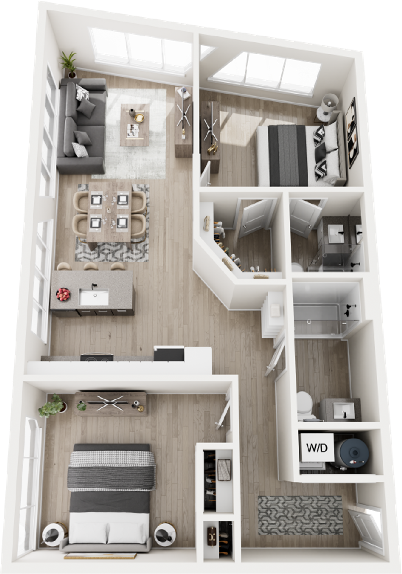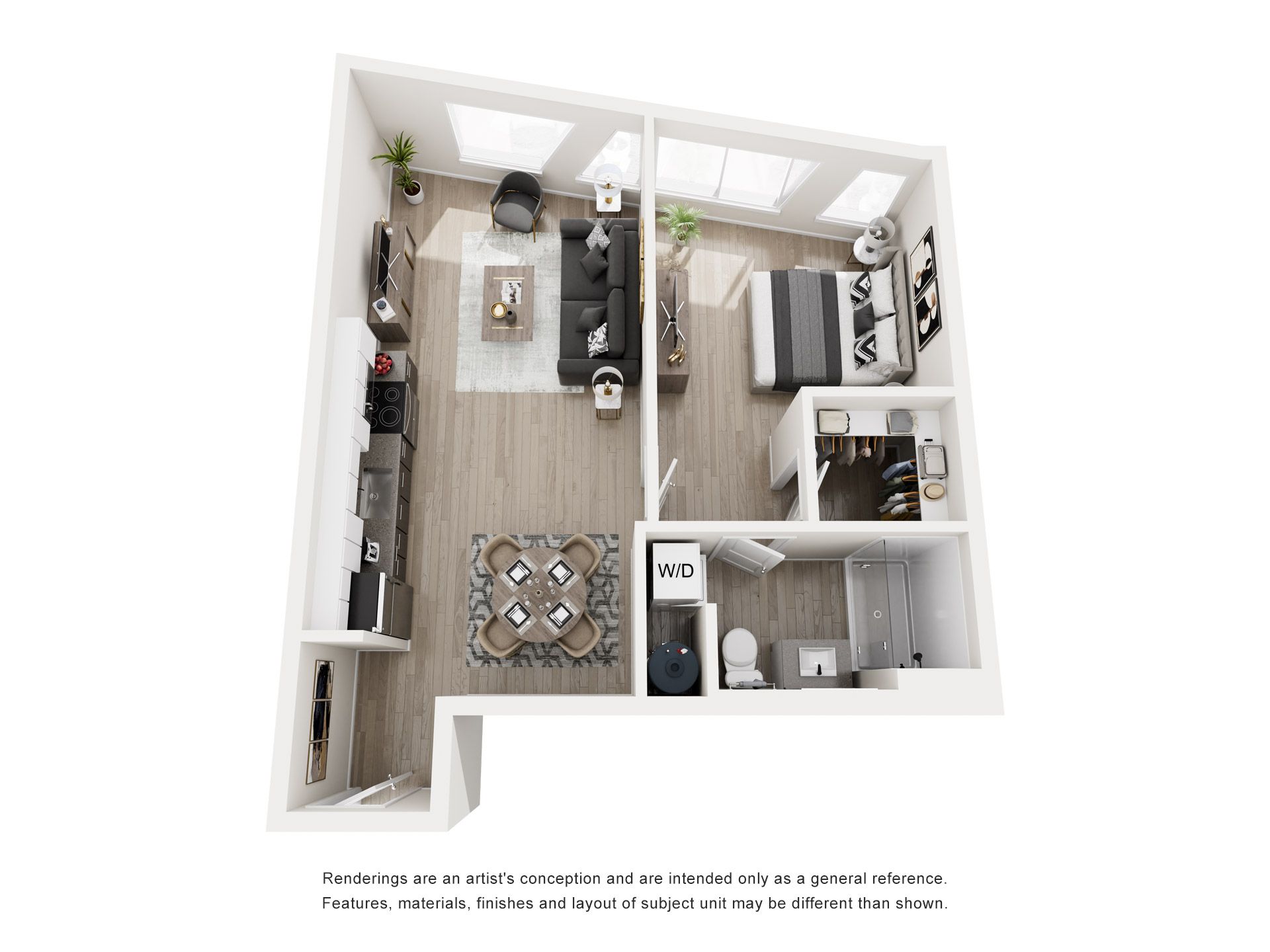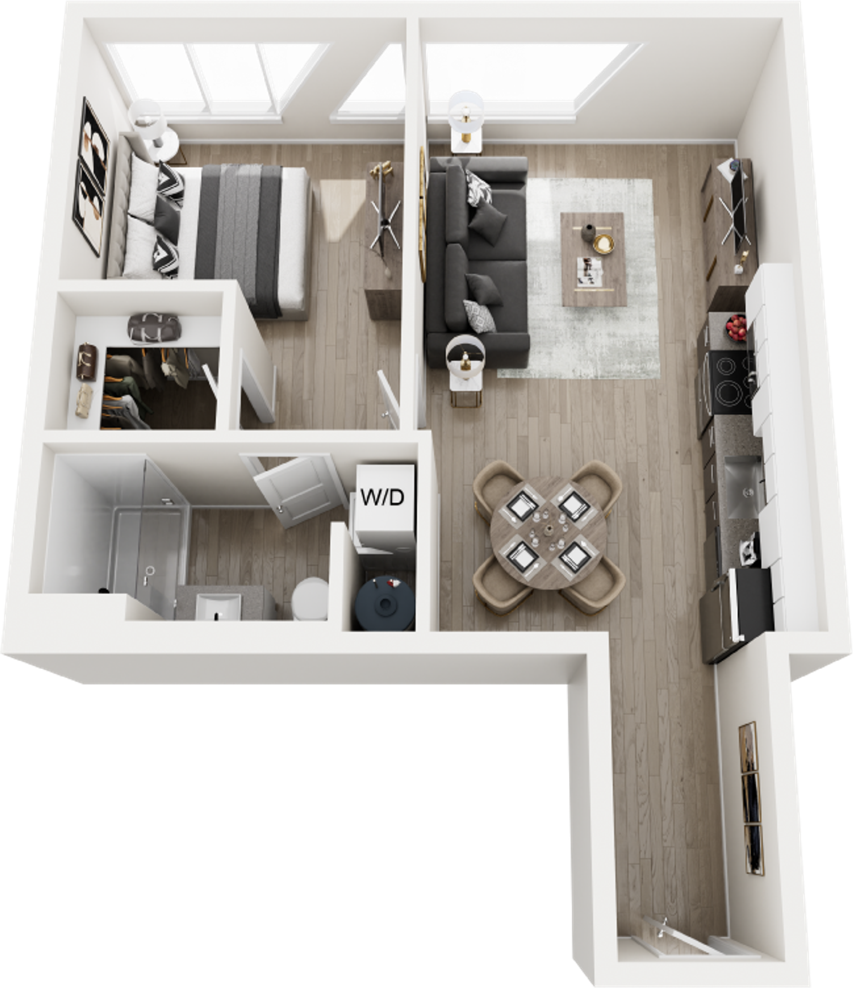 Perfectly scaled for modern city living, our one-bedroom residences offer a refined retreat in the heart of the Roosevelt Road district. These brand-new apartment homes feature open-concept layouts designed to maximize space, light, and functionality. Luxury vinyl plank flooring flows throughout, while high-end kitchens showcase quartz countertops, custom cabinetry, and stainless steel appliances. Expansive windows bring in abundant natural light, creating a bright and energizing atmosphere. Each home includes an in-unit washer and dryer for added convenience.