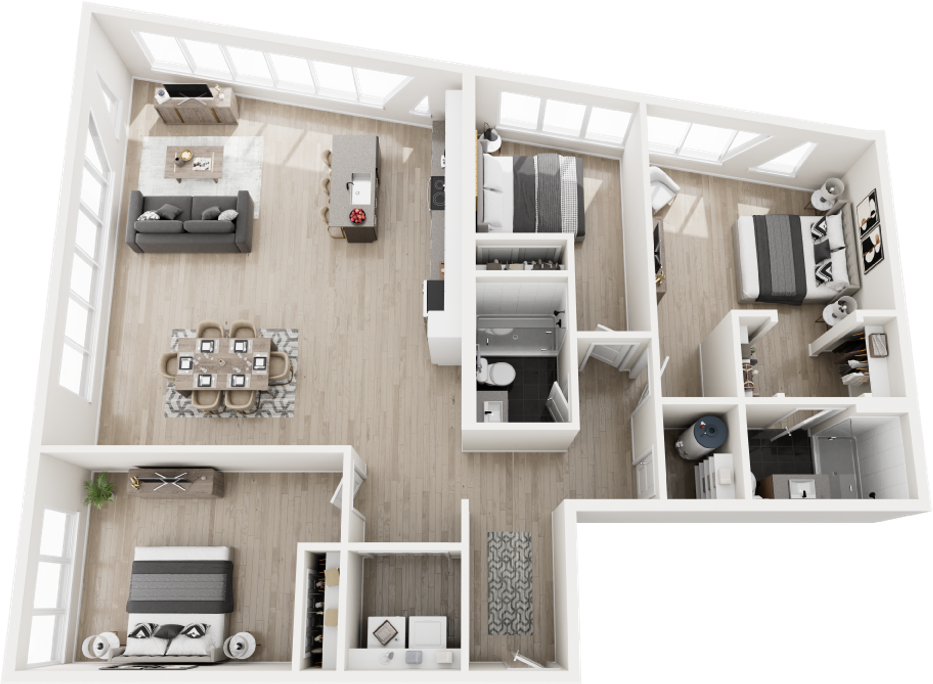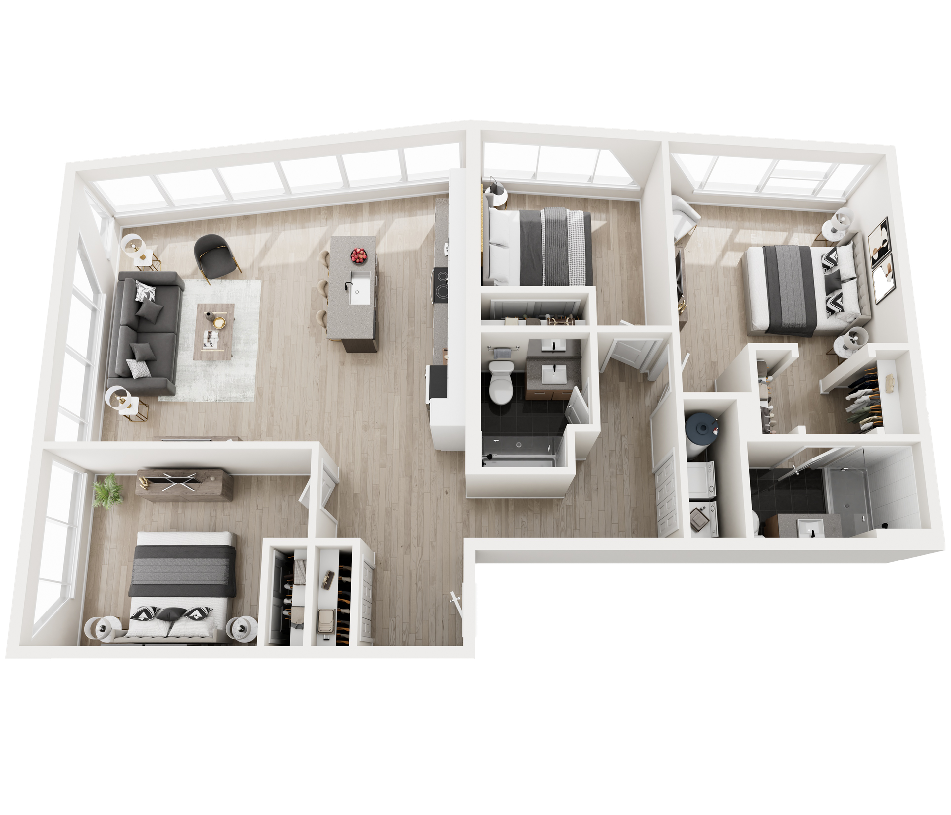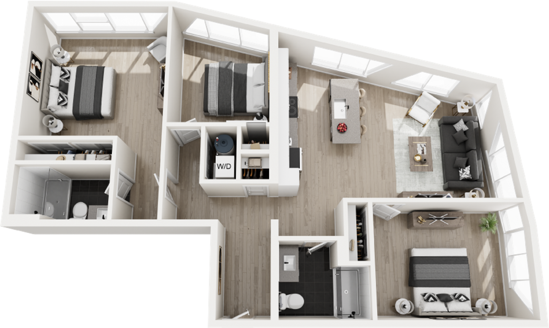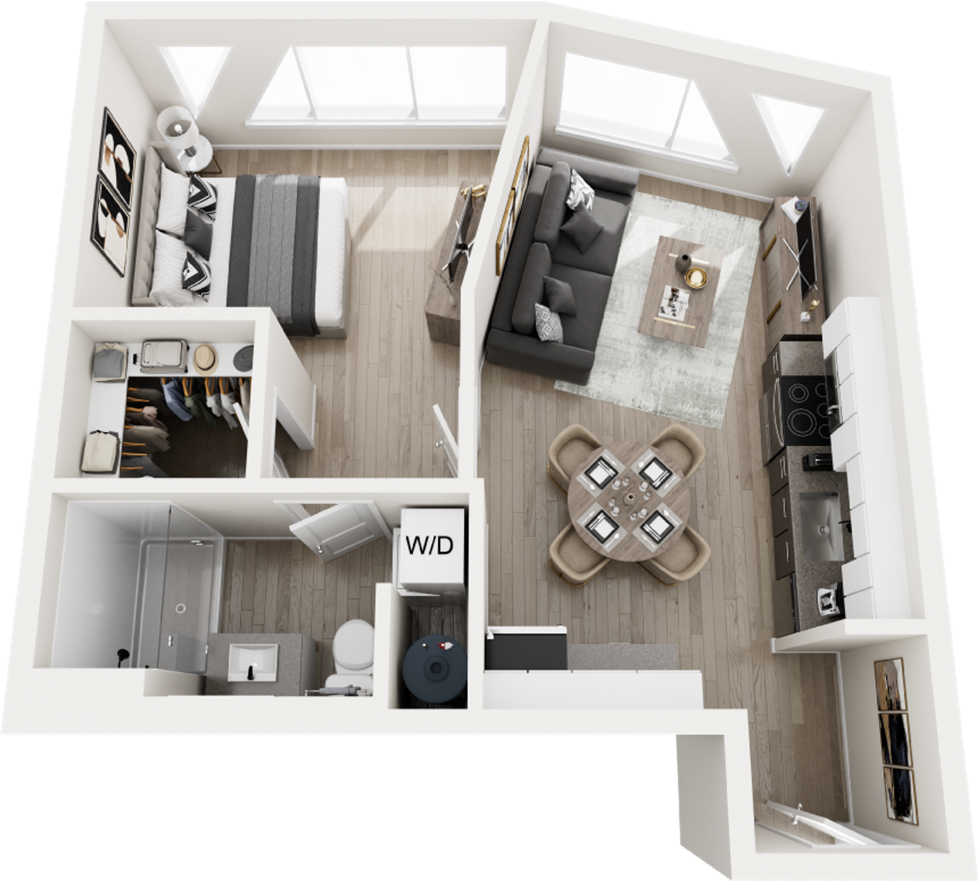 Perfectly scaled for modern city living, our one-bedroom residences offer a refined retreat in the heart of the Roosevelt Road district. These brand-new apartment homes feature open-concept layouts designed to maximize space, light, and functionality. Luxury vinyl plank flooring flows throughout, while high-end kitchens showcase quartz countertops, custom cabinetry, and stainless steel appliances. Expansive windows bring in abundant natural light, creating a bright and energizing atmosphere. Each home includes an in-unit washer and dryer for added convenience.