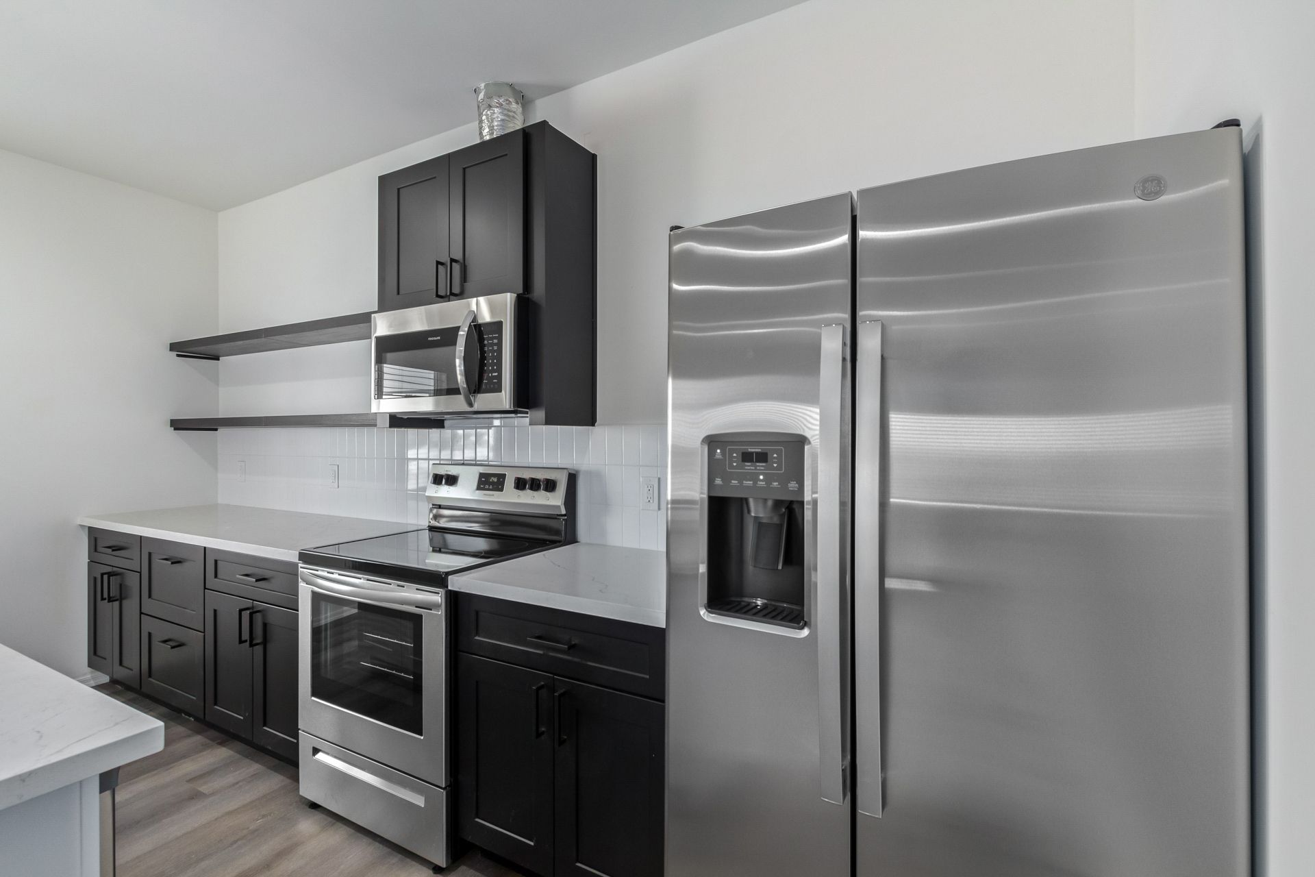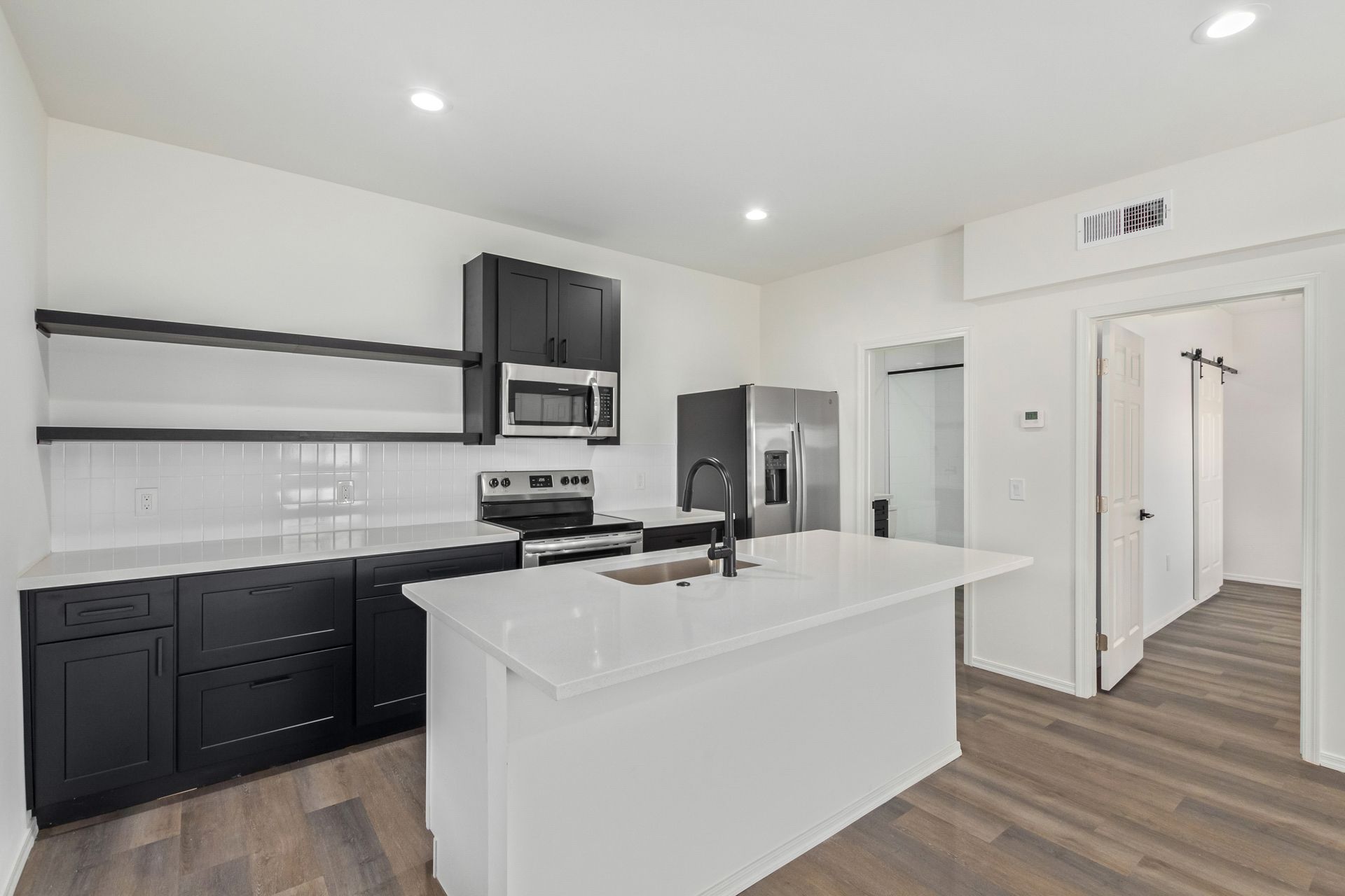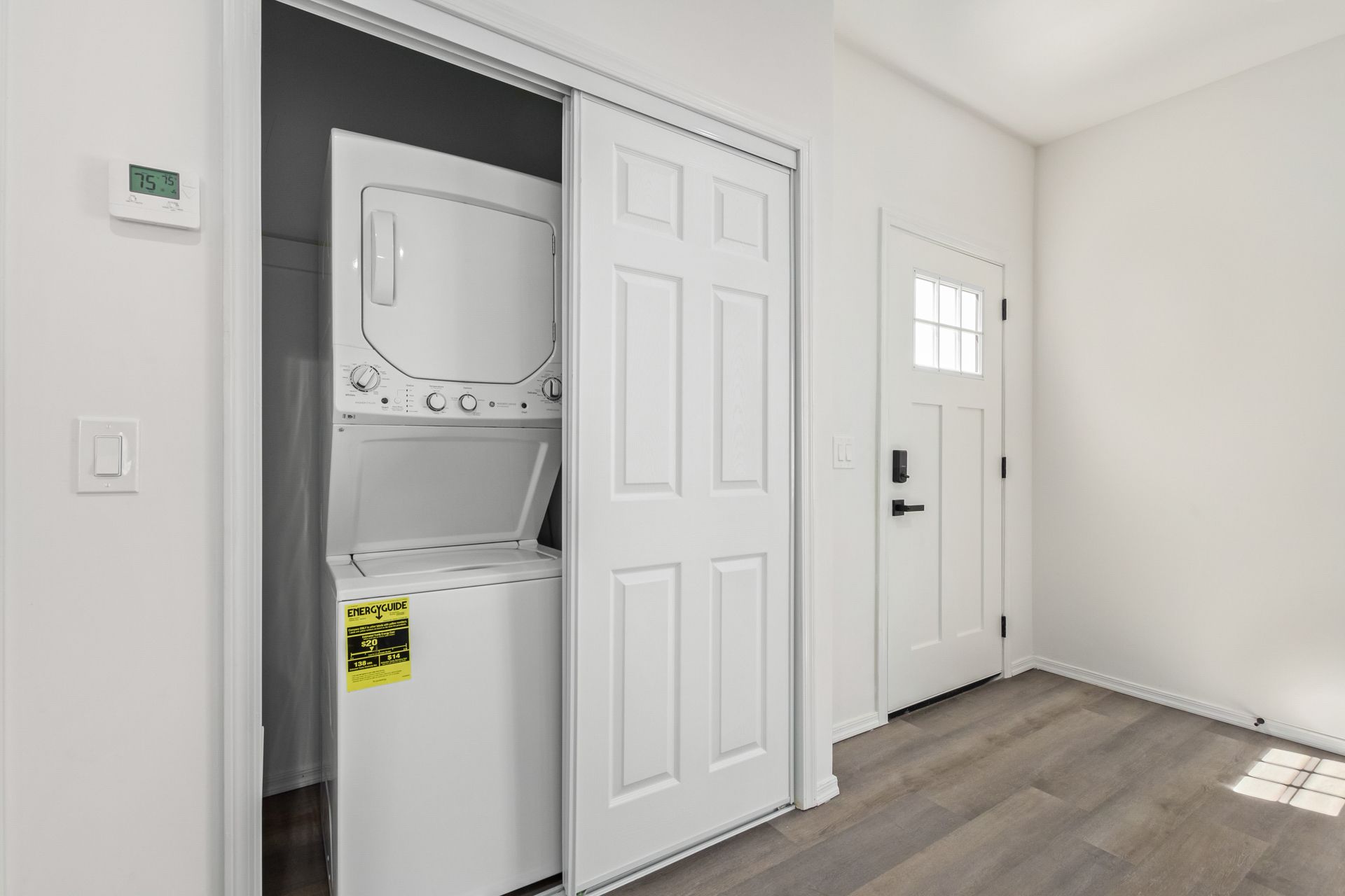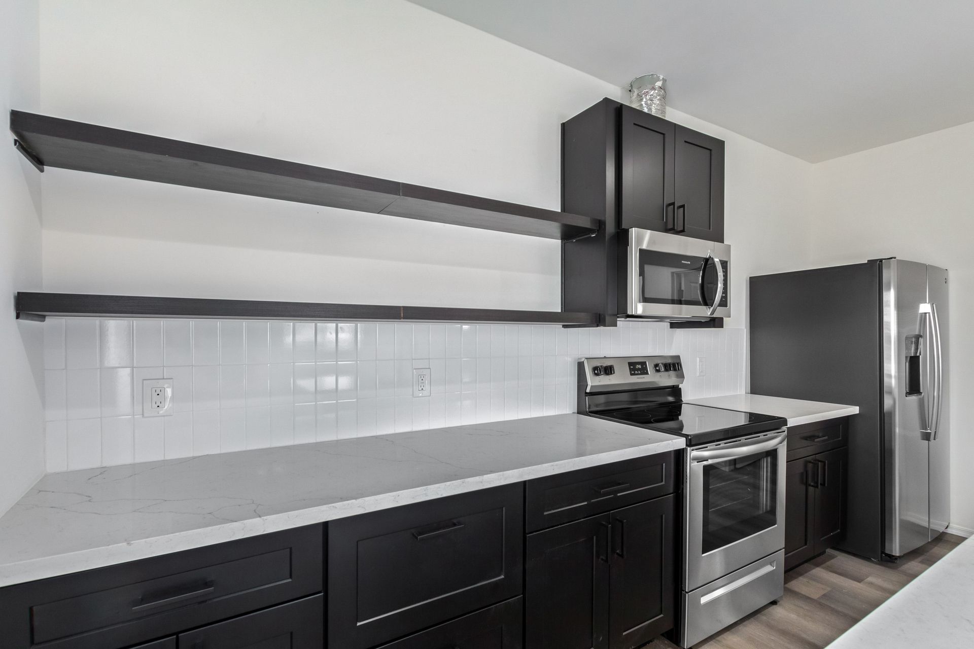 Each home offers modern, open-concept layouts with upscale finishes including white quartz countertops, tile backsplashes, floating shelves, black shaker cabinets, and stainless steel appliances. Enjoy the convenience of in-home washer/dryers and a beautifully landscaped shared lawn with a grill. Dedicated parking is included for all homes except the studio, which uses street parking.
