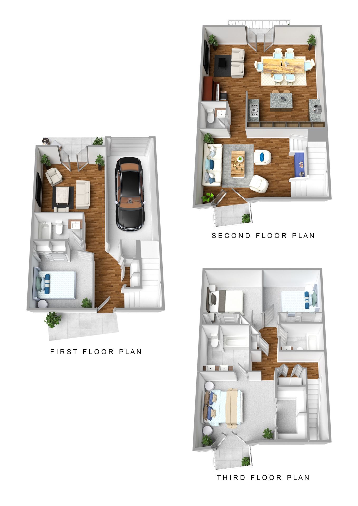 Our newly constructed 4-bedroom, 3.5-bath townhomes span an impressive 2,200 square feet and are thoughtfully designed with families, roommates, and professionals in mind. Each residence features a bright, open-concept layout with stunning quartz countertops, white shaker-style cabinetry, stainless steel appliances, and durable luxury vinyl plank flooring. Private balconies with scenic park views, tiled walk-in showers, and dual vanities add a layer of sophistication and function to everyday living.