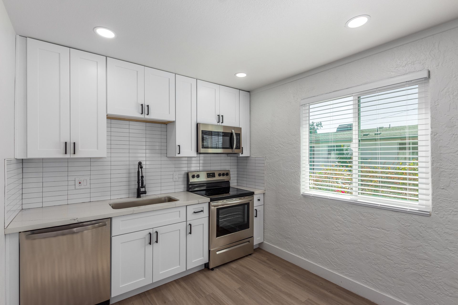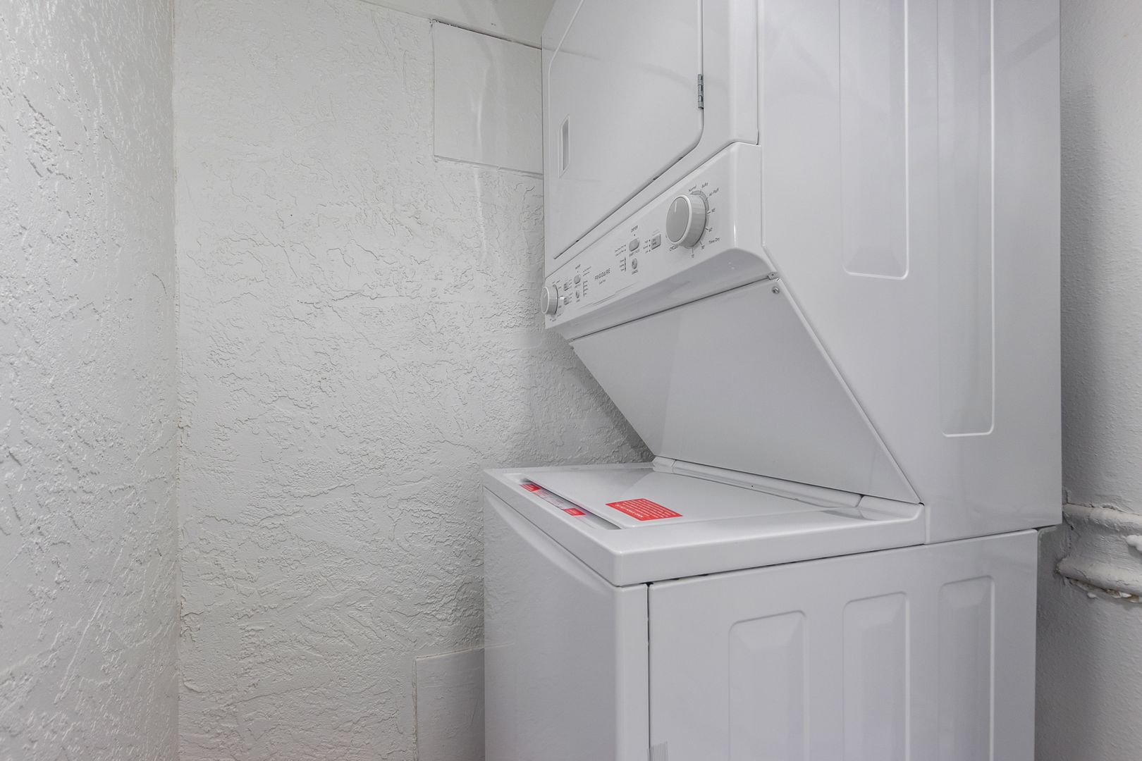 Marvel at the sleek allure of stainless steel appliances adorning the kitchen, complemented by the elegance of quartz counters and a tasteful tile backsplash. Within, the convenience of a washer and dryer awaits, ensuring effortless household chores.