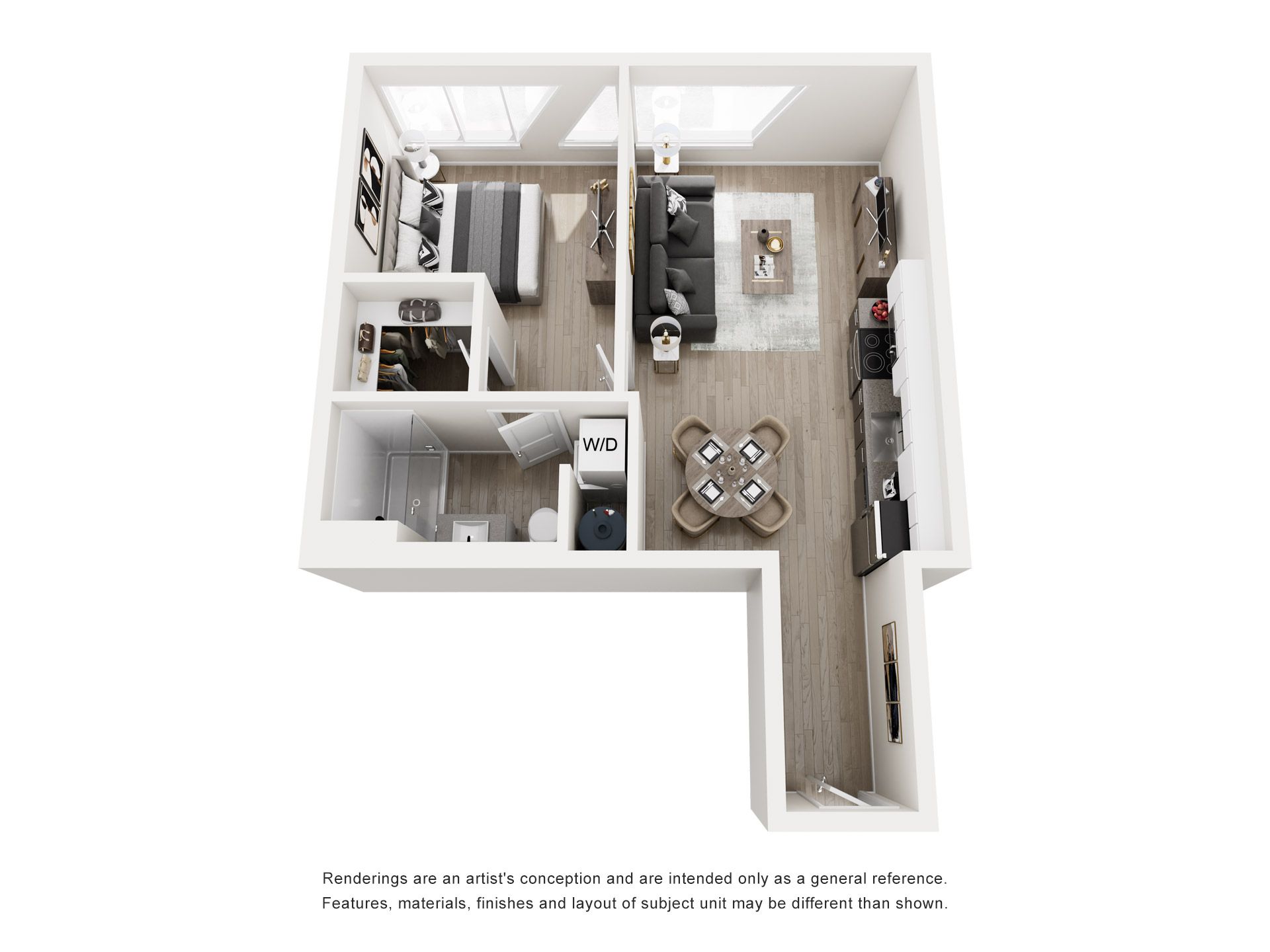 Perfectly scaled for modern city living, our one-bedroom residences offer a refined retreat in the heart of the Roosevelt Road district. These brand-new apartment homes feature open-concept layouts designed to maximize space, light, and functionality. Luxury vinyl plank flooring flows throughout, while high-end kitchens showcase quartz countertops, custom cabinetry, and stainless steel appliances. Expansive windows bring in abundant natural light, creating a bright and energizing atmosphere. Each home includes an in-unit washer and dryer for added convenience.