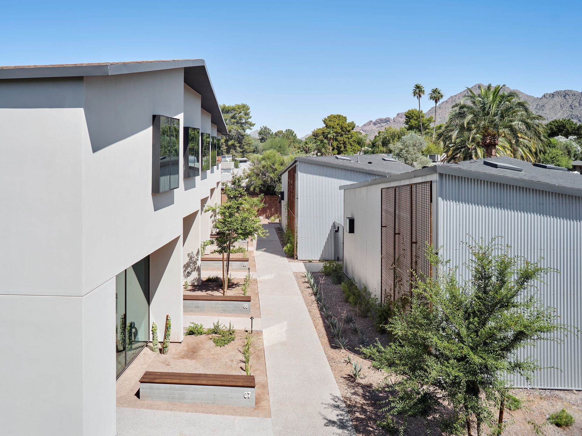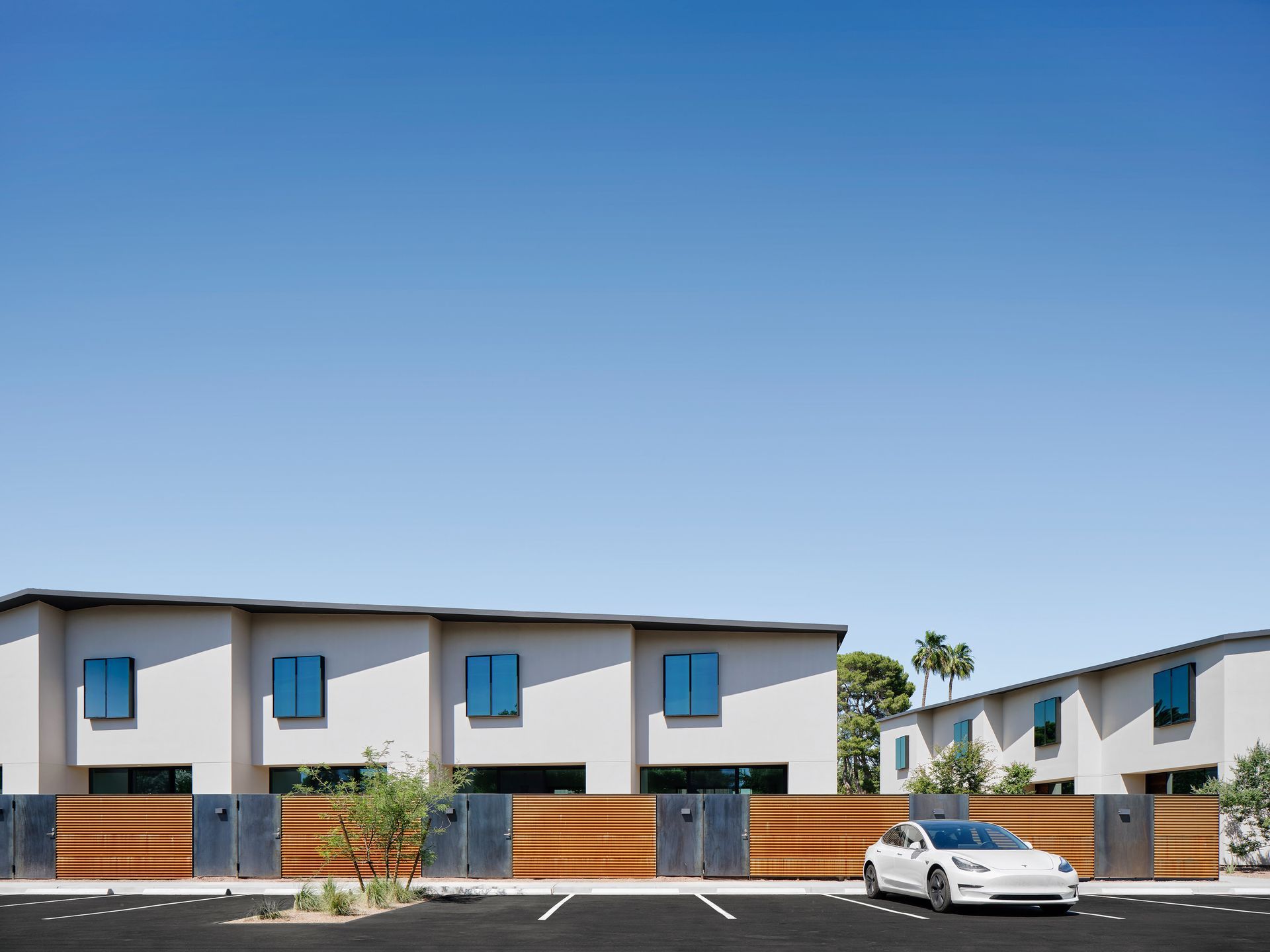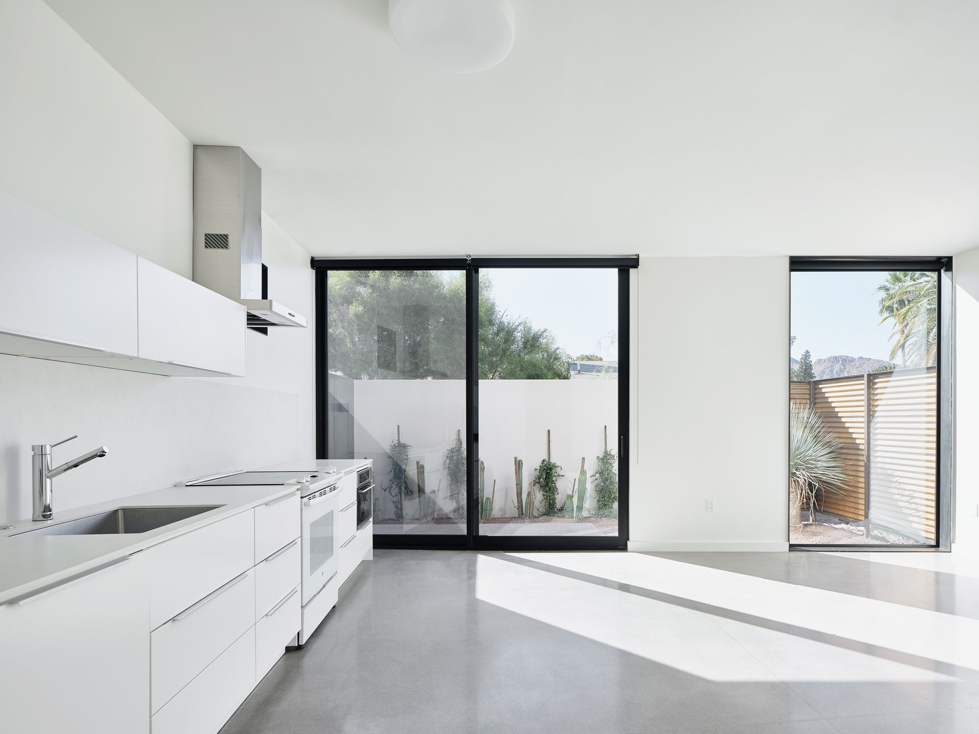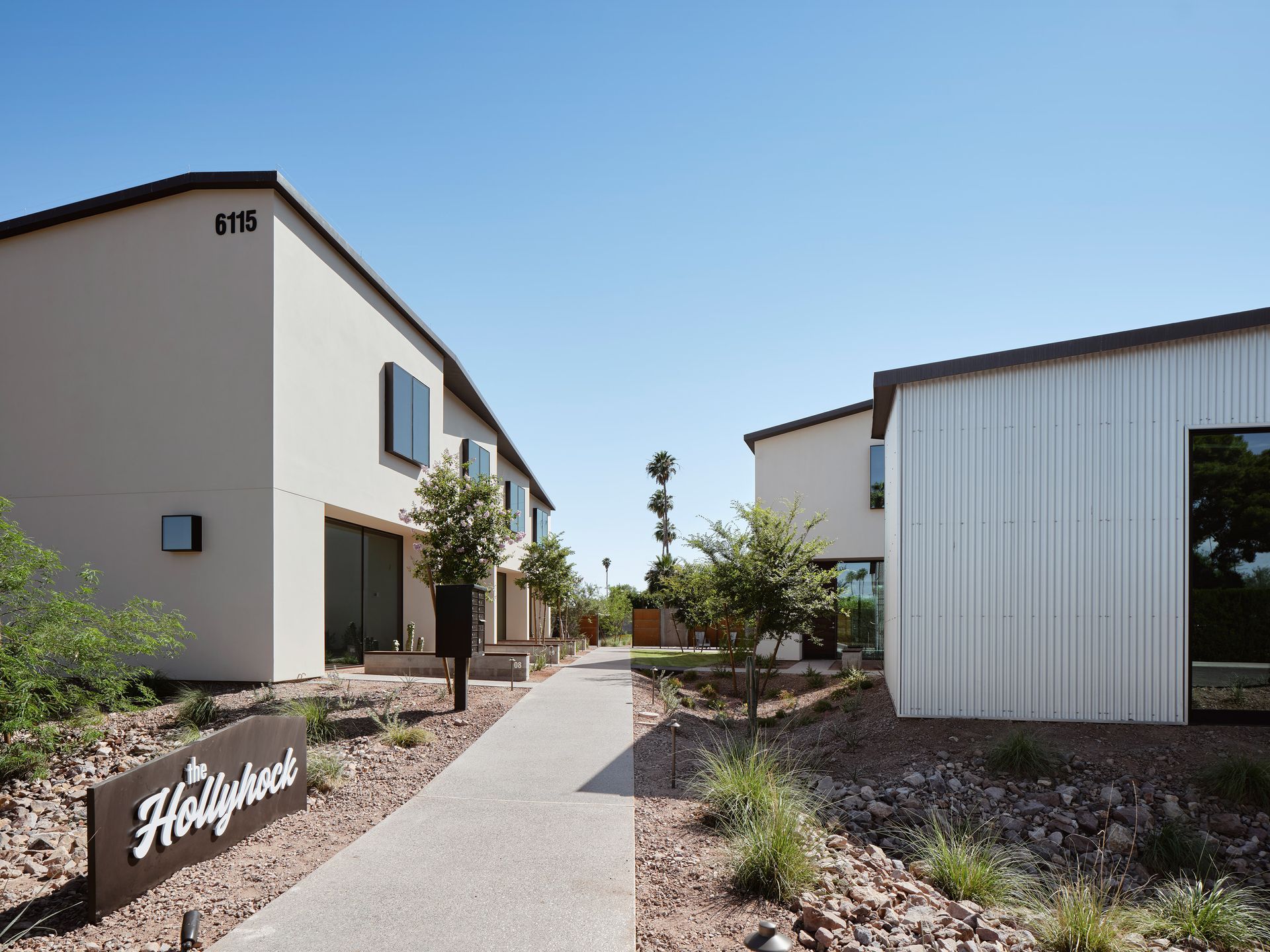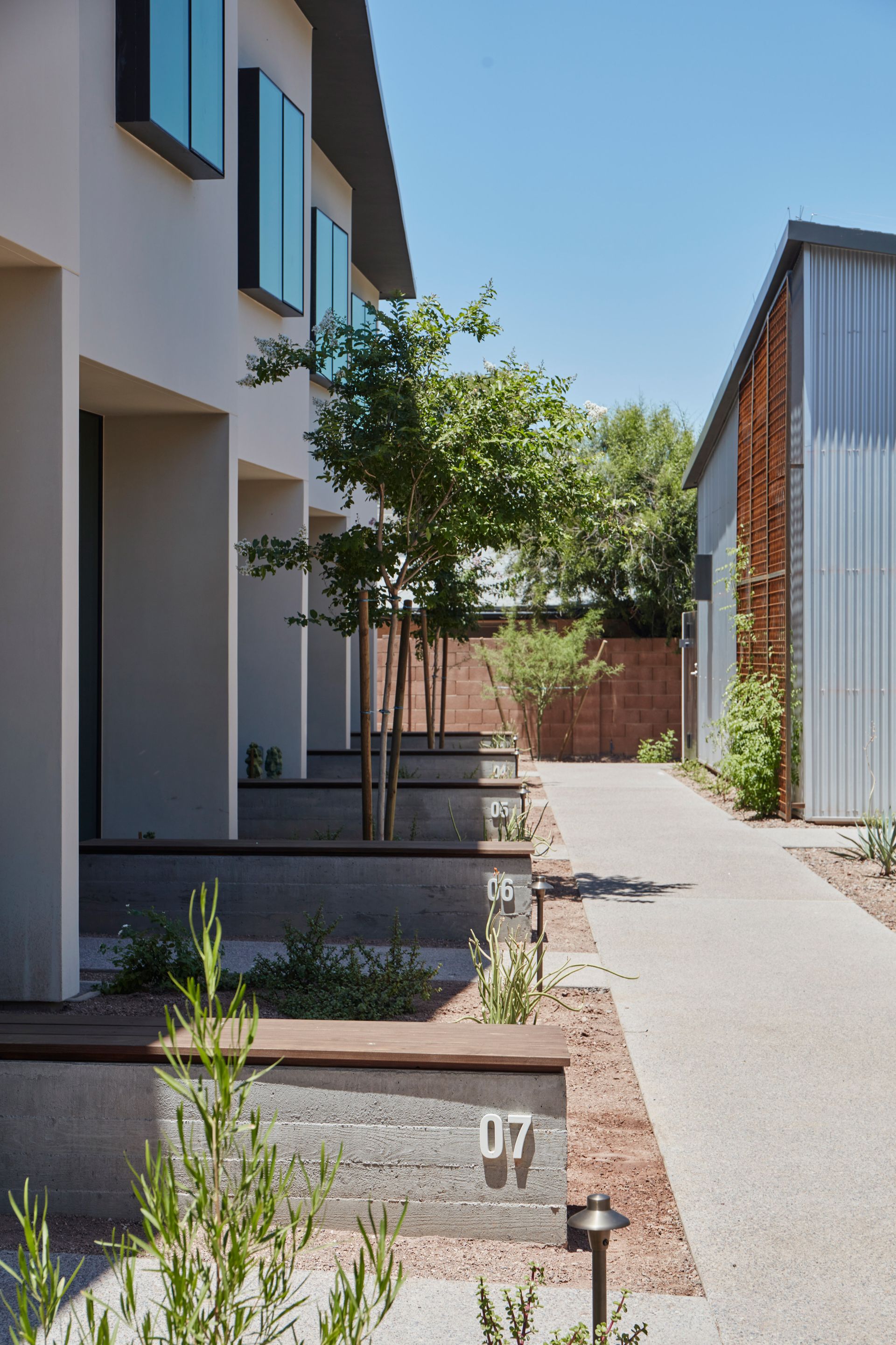 The Hollyhock was built with the utmost attention to detail, offering a combination of luxury and comfort that fits perfectly within its residential surroundings. The modern design highlights clean lines, natural materials, and a connection to the outdoors, thanks to the expansive windows and private patios. Each unit includes a mid-century style desert landscaped front entry complimenting the dramatic wood front door, high-end appliances and lighting, large in-unit washer/dryer, assigned covered parking (2 spots per unit), designer tile in kitchen and bath and an open floor plan.