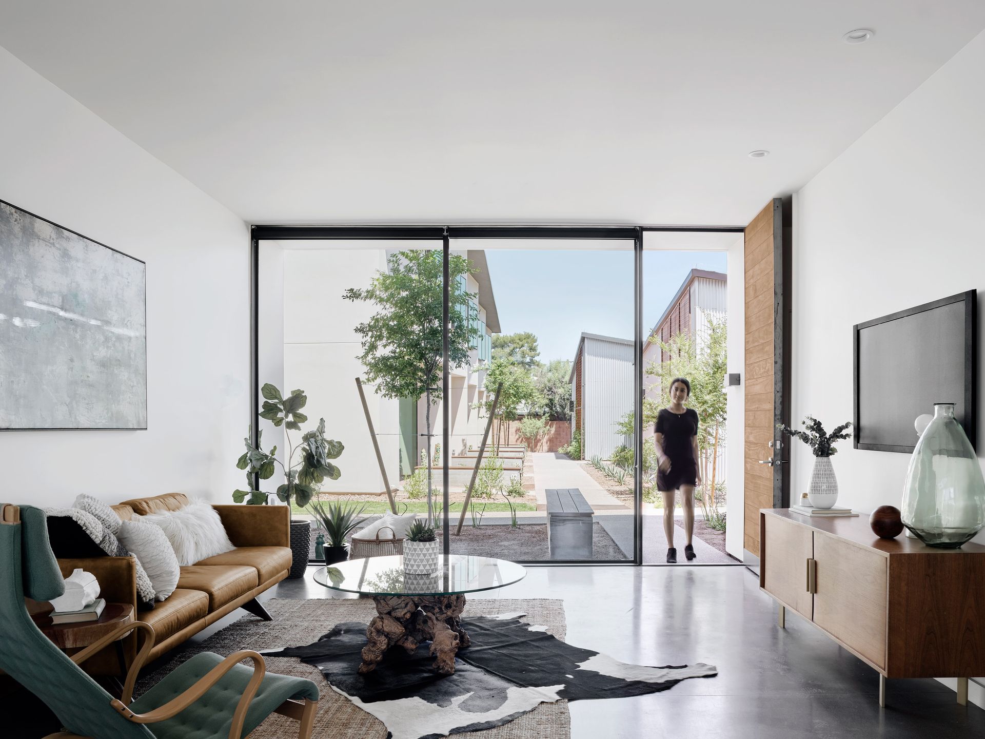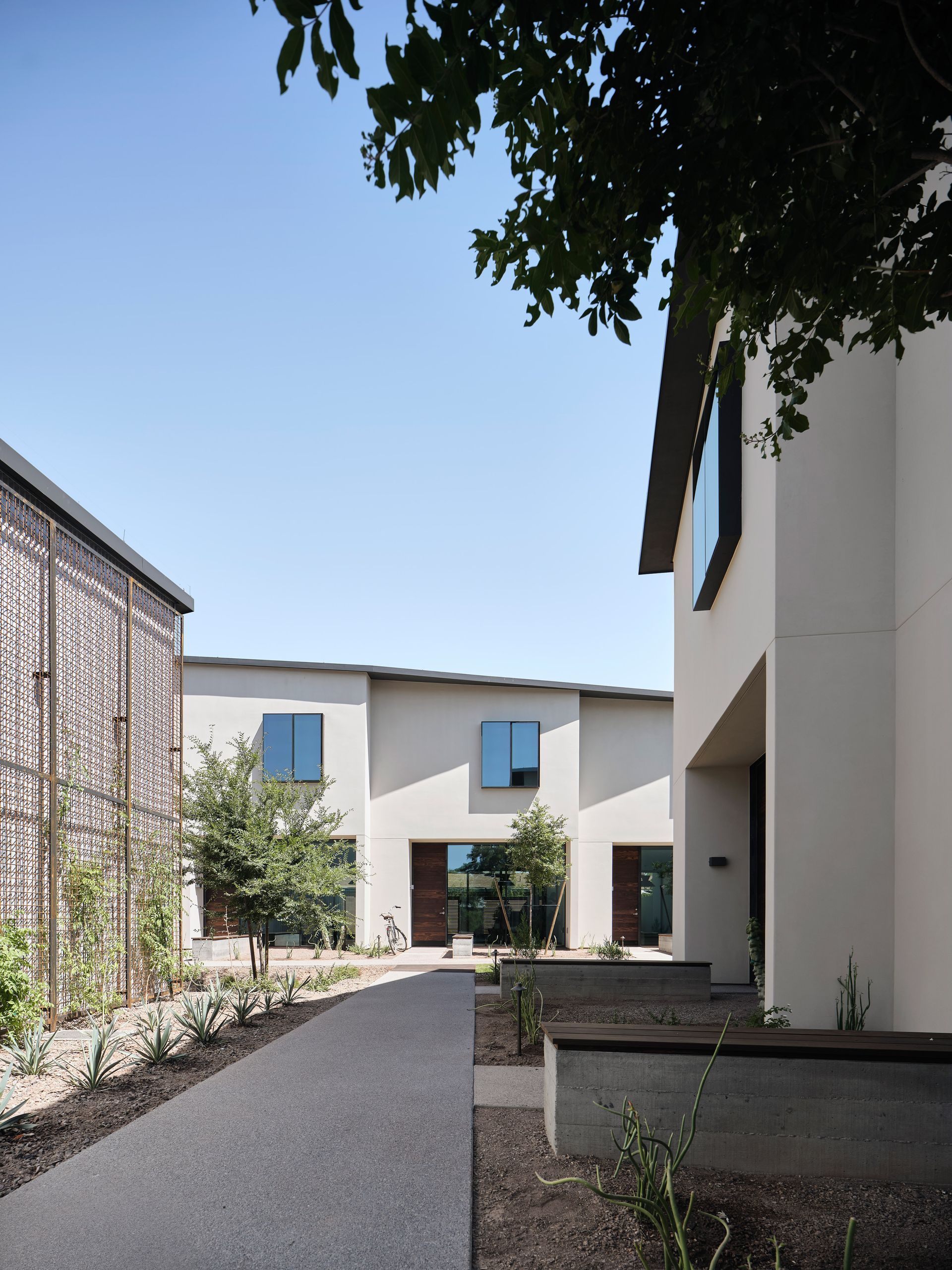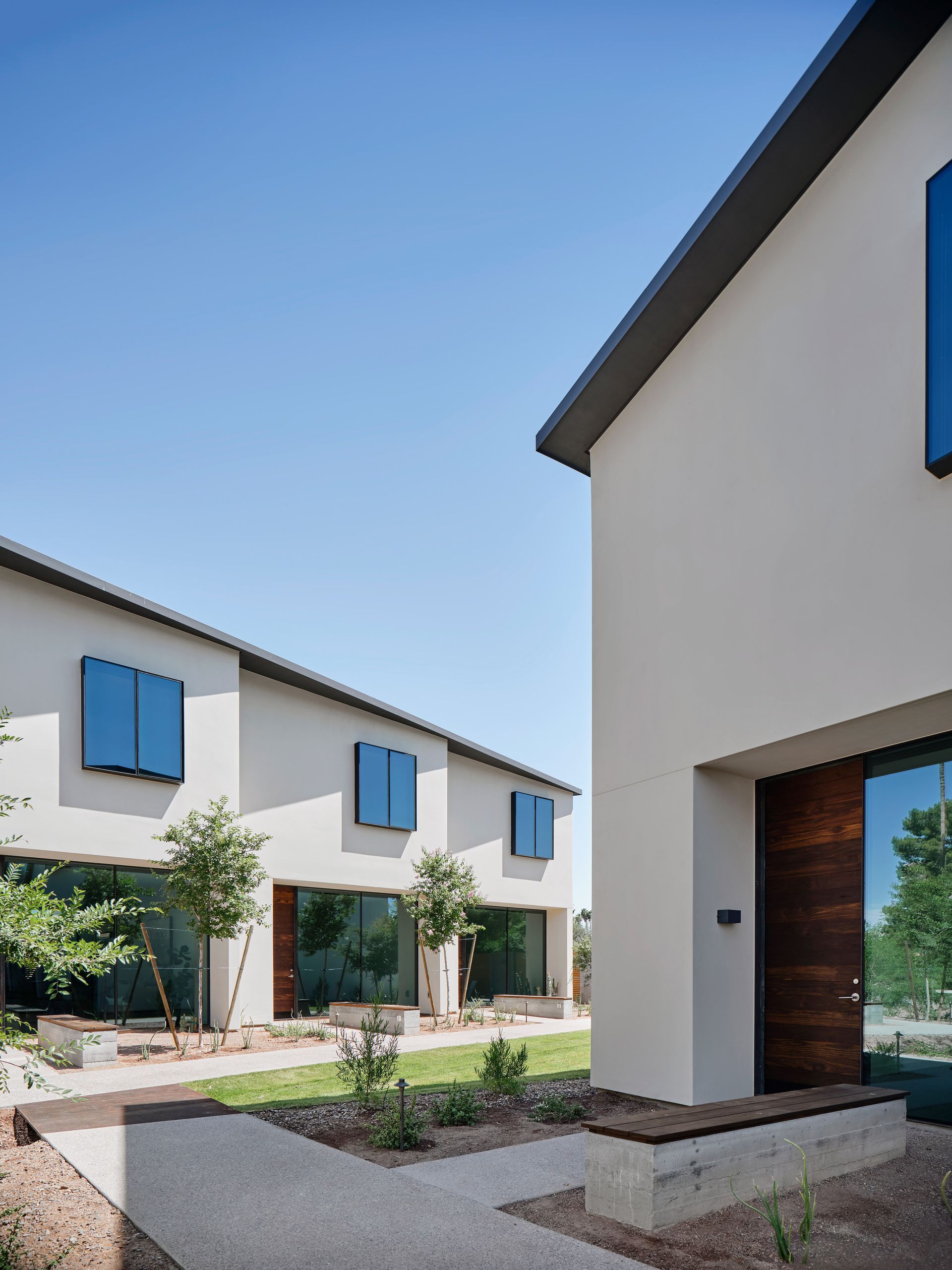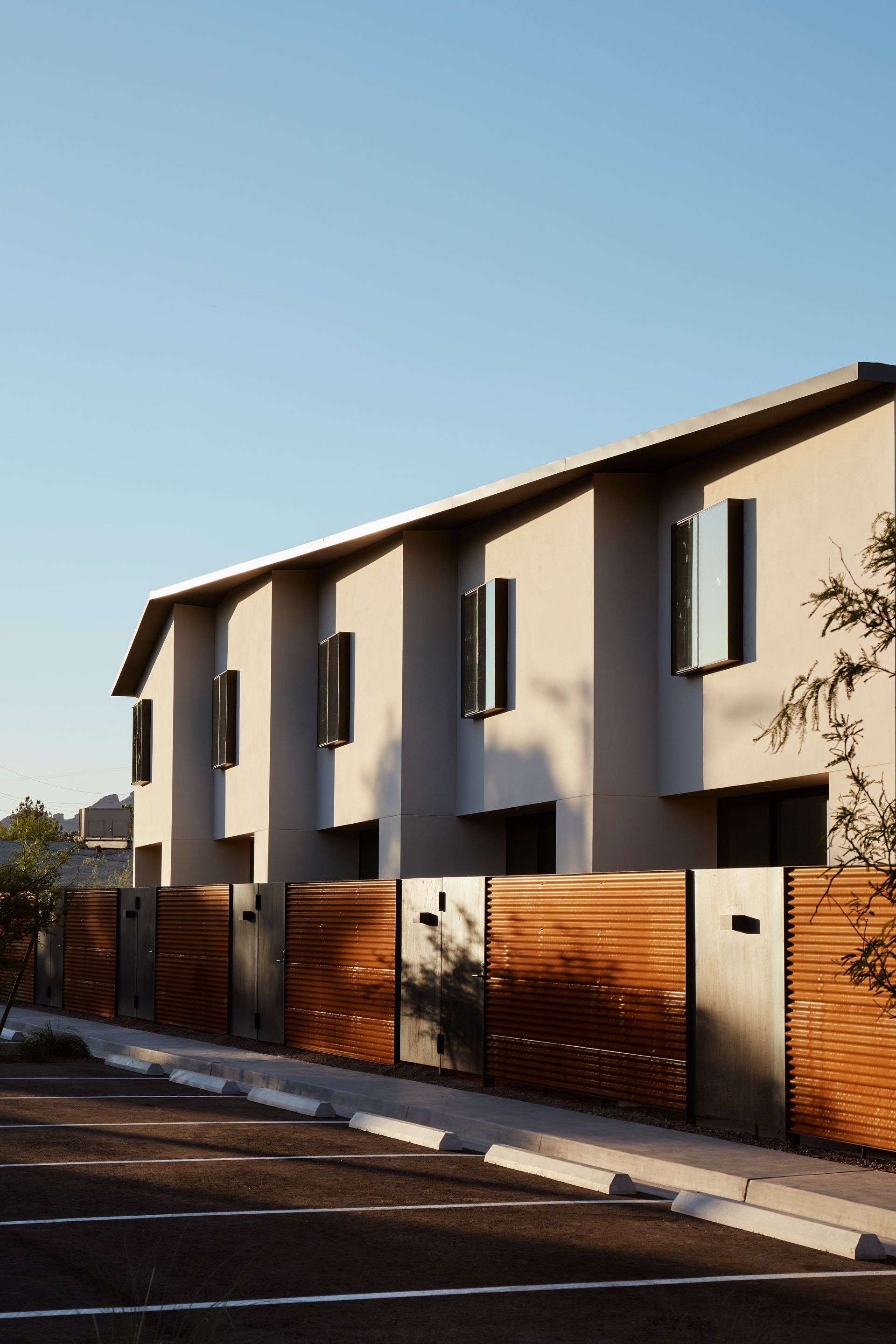 The Hollyhock was built with the utmost attention to detail, offering a combination of luxury and comfort that fits perfectly within its residential surroundings. The modern design highlights clean lines, natural materials, and a connection to the outdoors, thanks to the expansive windows and private patios. Each unit includes a mid-century style desert landscaped front entry complimenting the dramatic wood front door, high-end appliances and lighting, large in-unit washer/dryer, assigned covered parking (2 spots per unit), designer tile in kitchen and bath and an open floor plan.