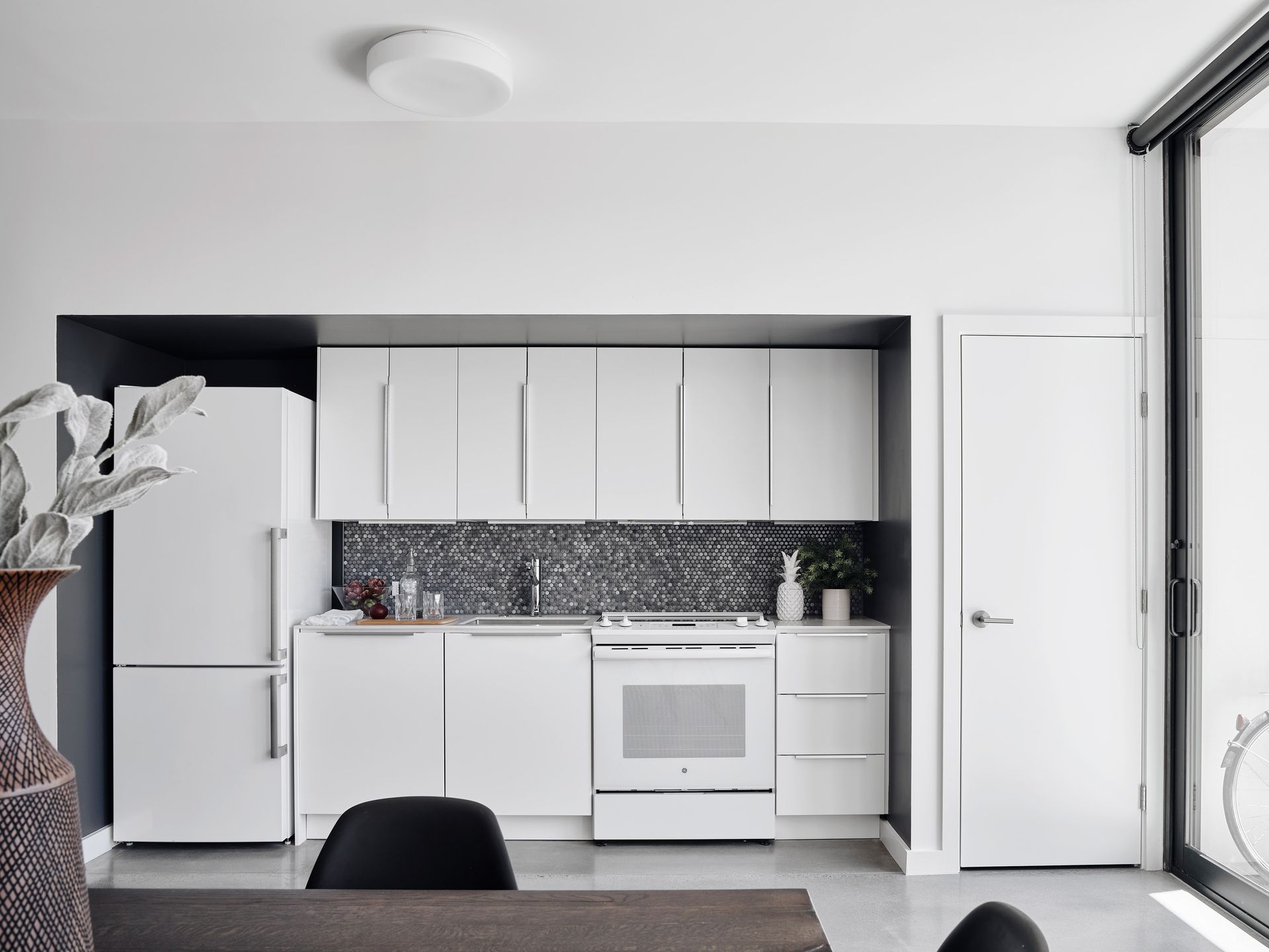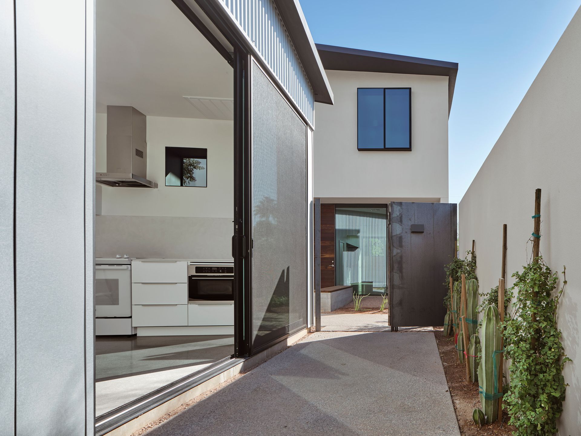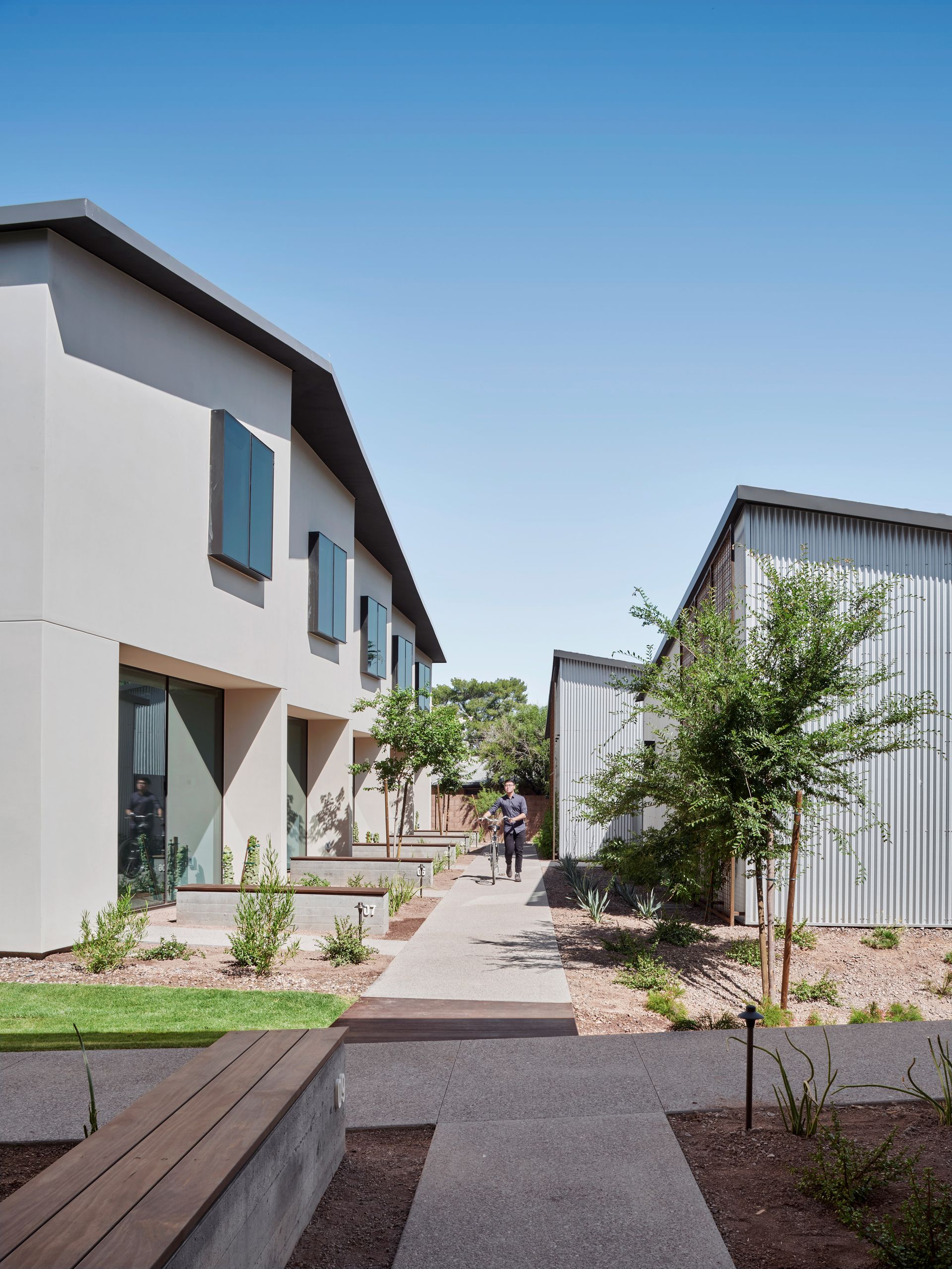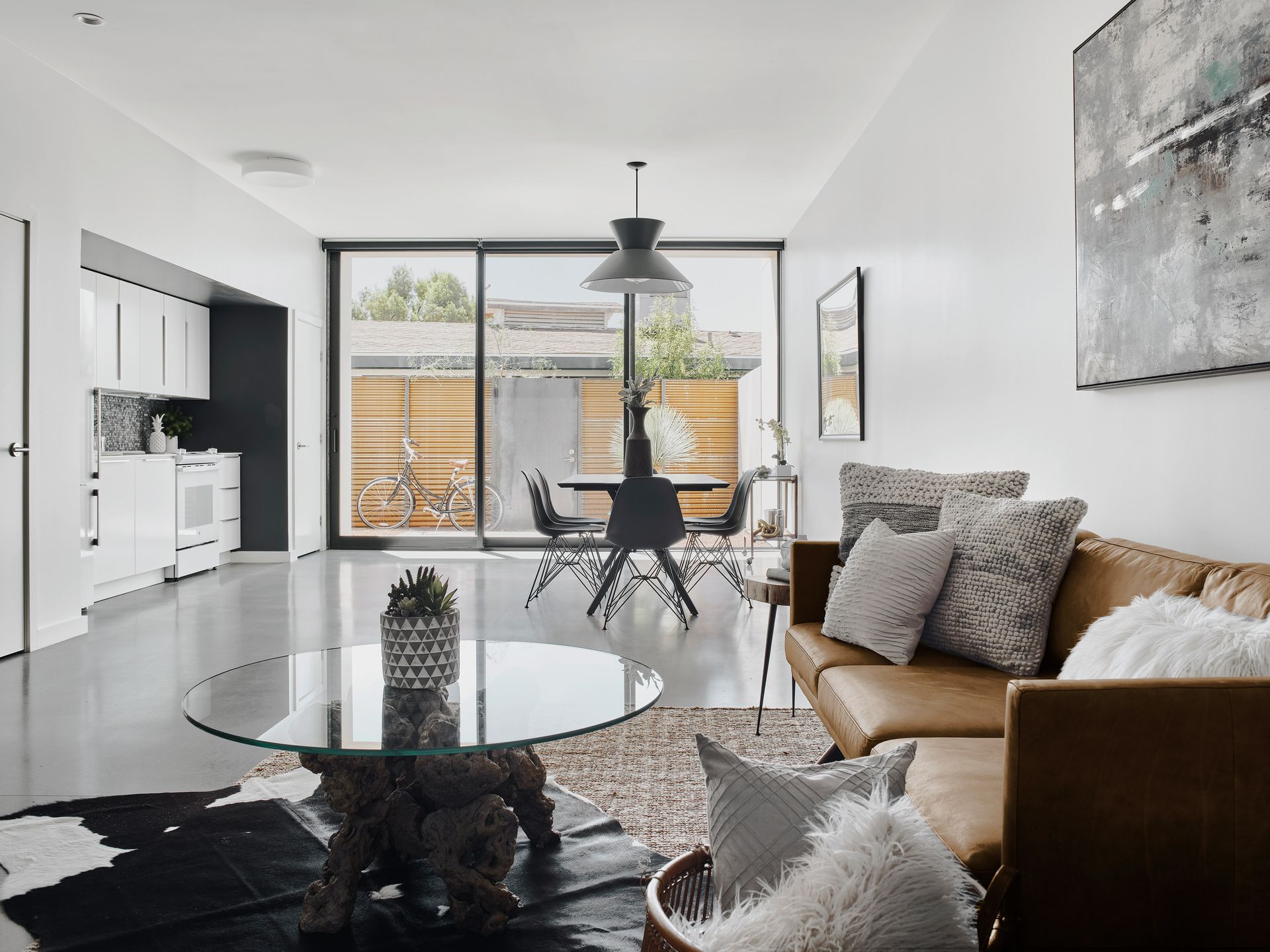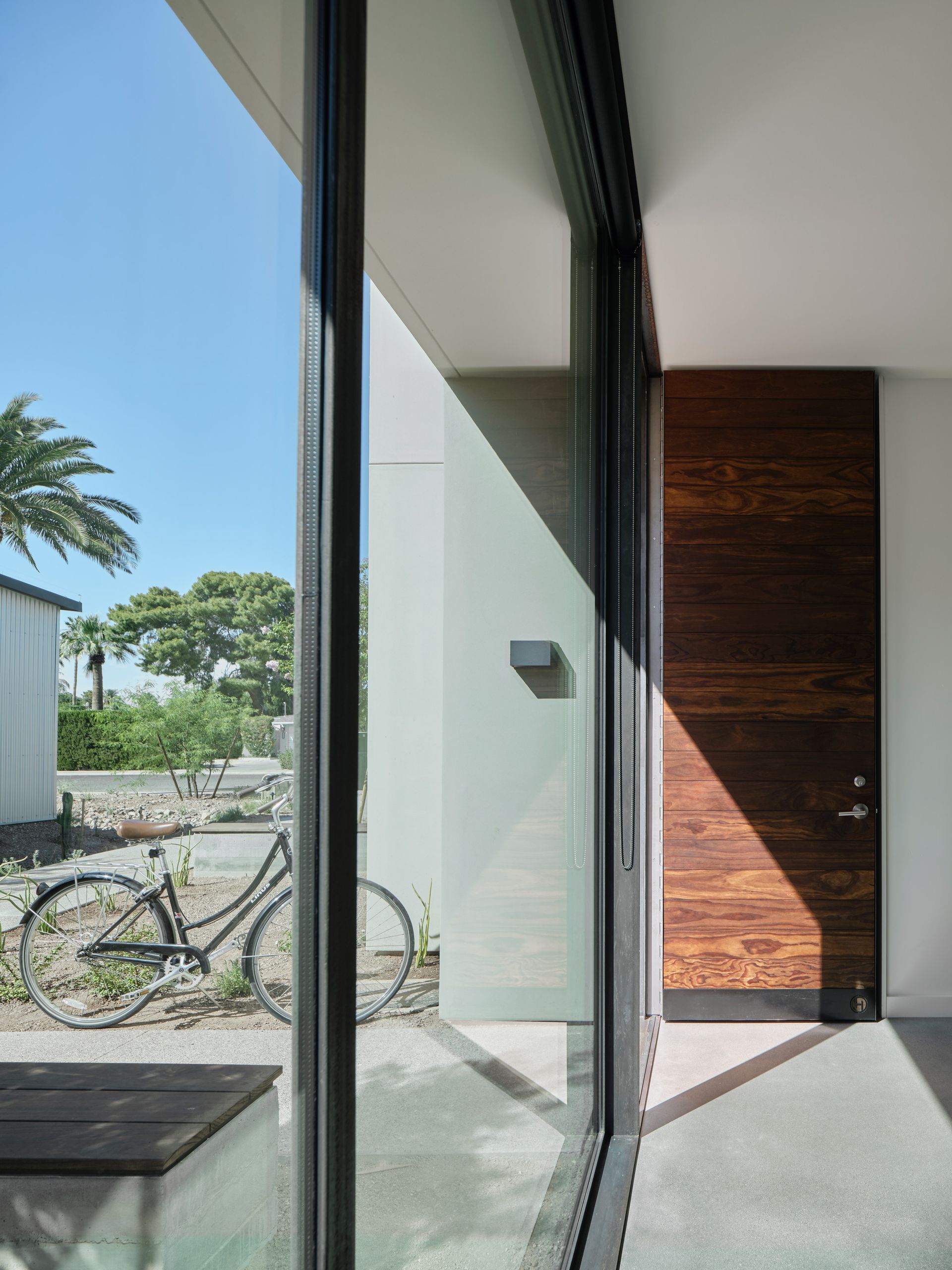 The Hollyhock was built with the utmost attention to detail, offering a combination of luxury and comfort that fits perfectly within its residential surroundings. The modern design highlights clean lines, natural materials, and a connection to the outdoors, thanks to the expansive windows and private patios. Each unit includes a mid-century style desert landscaped front entry complimenting the dramatic wood front door, high-end appliances and lighting, large in-unit washer/dryer, assigned covered parking (2 spots per unit), designer tile in kitchen and bath and an open floor plan.